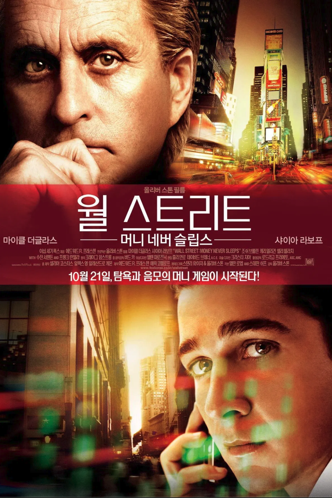 본 작품의 중심축인 고든 게코 역의 마이클 더글라스는 전편의 카리스마를 유지하면서도 세월의 흔적이 느껴지는 노련한 연기를 선보인다. 그는 "탐욕은 좋은 것이다"라는 자신의 과거 명언을 "탐욕은 이제 합법이다"라고 수정하며 진화한 자본주의의 괴물을 완벽하게 재현했다. 필자는 마이클 더글라스의 연기가 단순한 악역을 넘어 시스템의 모순을 꿰뚫어 보는 예언자적 면모를 지니고 있다는 점에 깊은 인상을 받았다. 제이크 무어 역의 샤이아 라보프는 야망과 정의감 사이에서 고뇌하는 젊은 금융인의 모습을 생동감 있게 그려냈다. 그는 스승의 복수와 자신의 성공, 그리고 연인과의 사랑 사이에서 줄타기하며 극의 몰입도를 높인다.